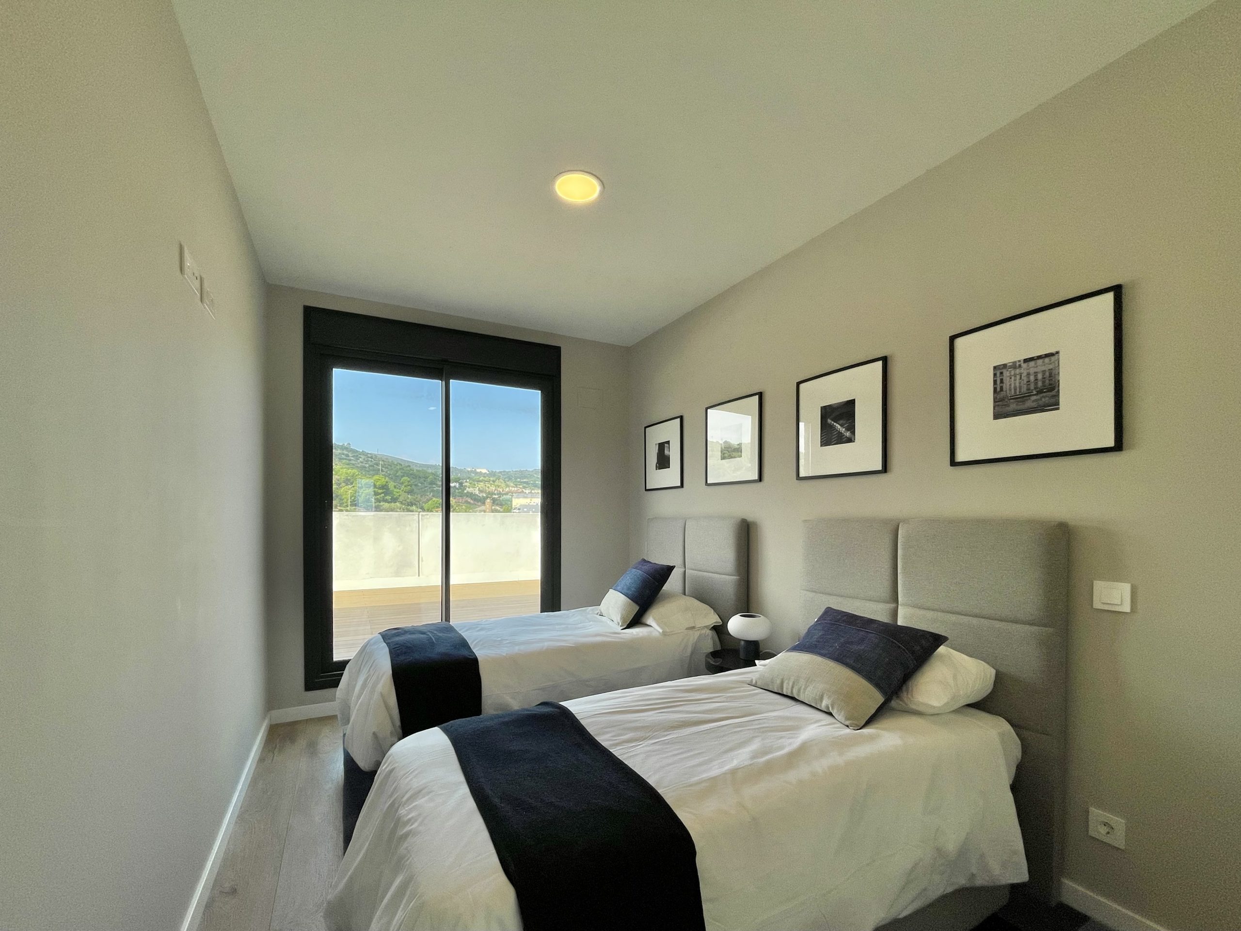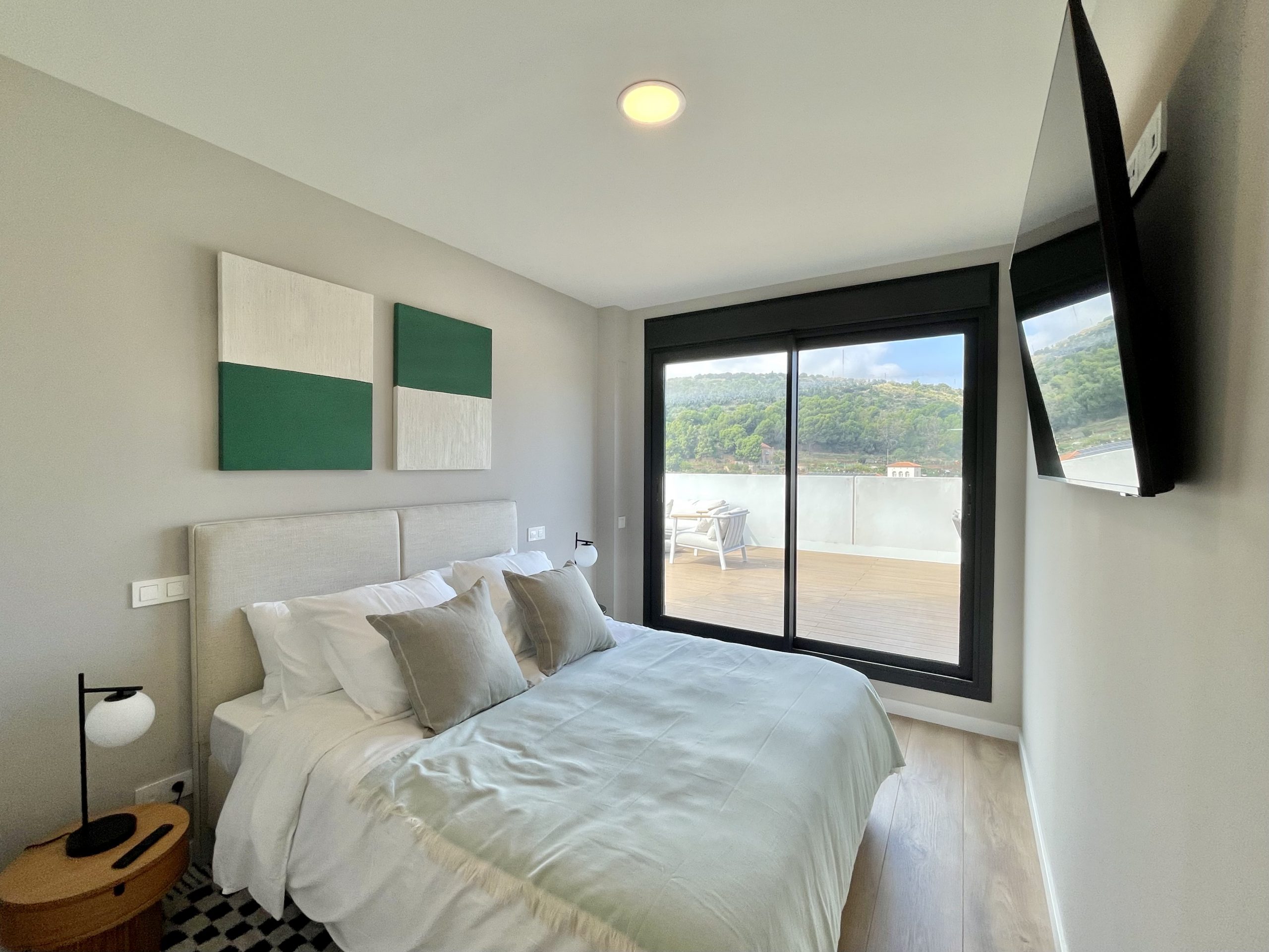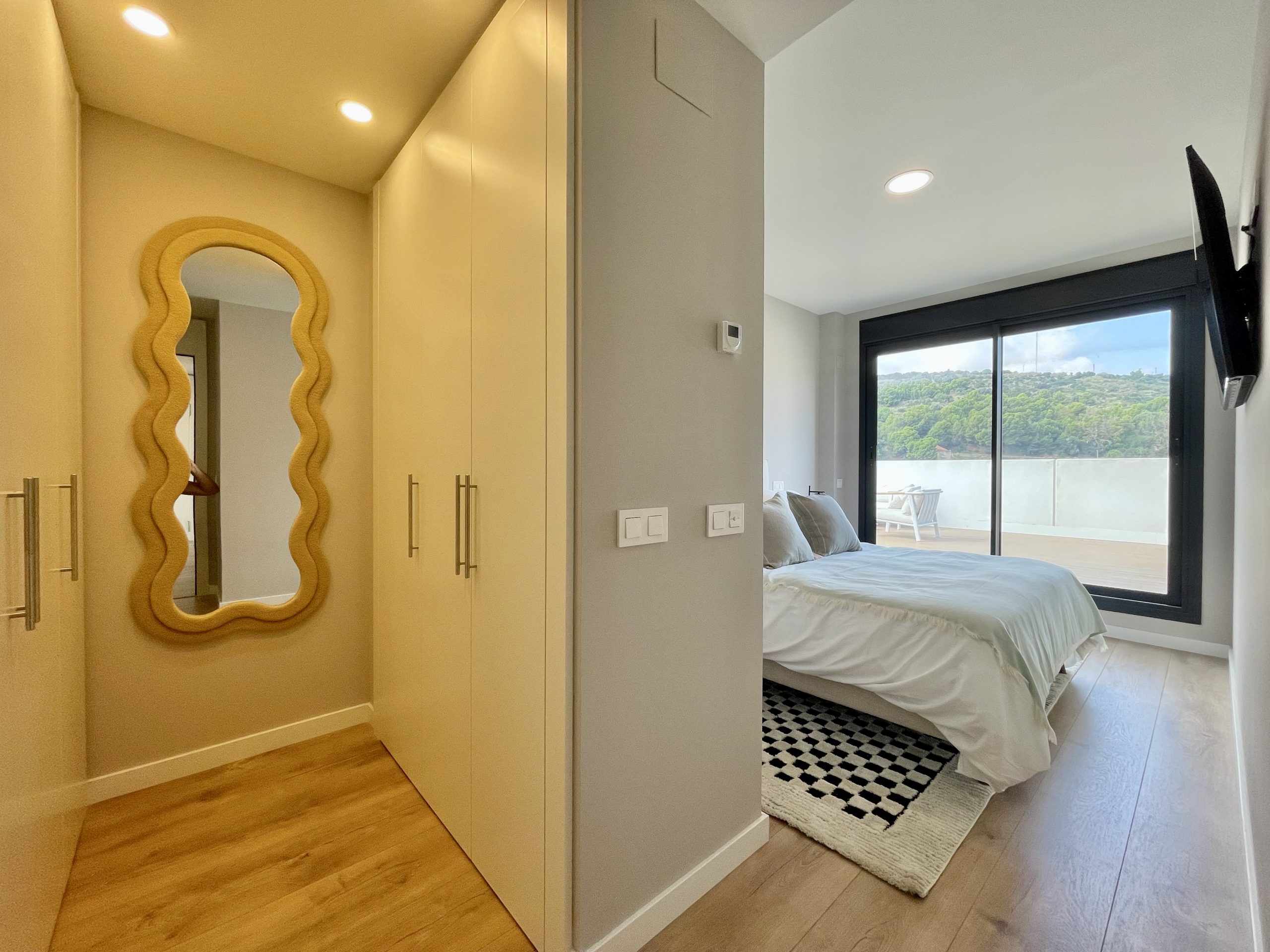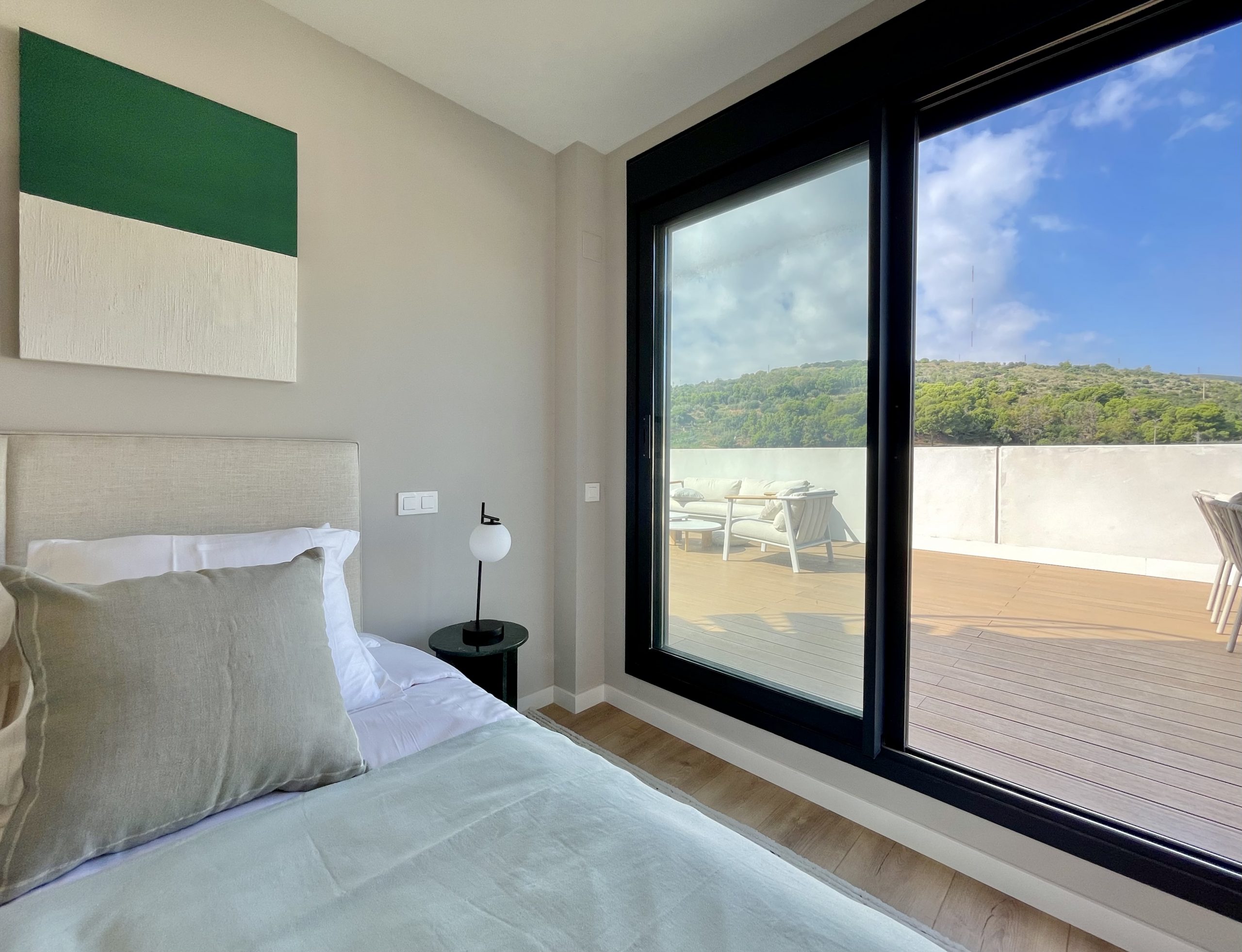 It features three double bedrooms, all with direct access to the terrace, including a master suite with a private bathroom, plus a second full bathroom. Its southeast-southwest orientation ensures natural light throughout the day and mountain views in the morning. As the final touch, the private rooftop solarium offers an impressive 360º panorama with a jacuzzi - the perfect retreat to relax and unwind.